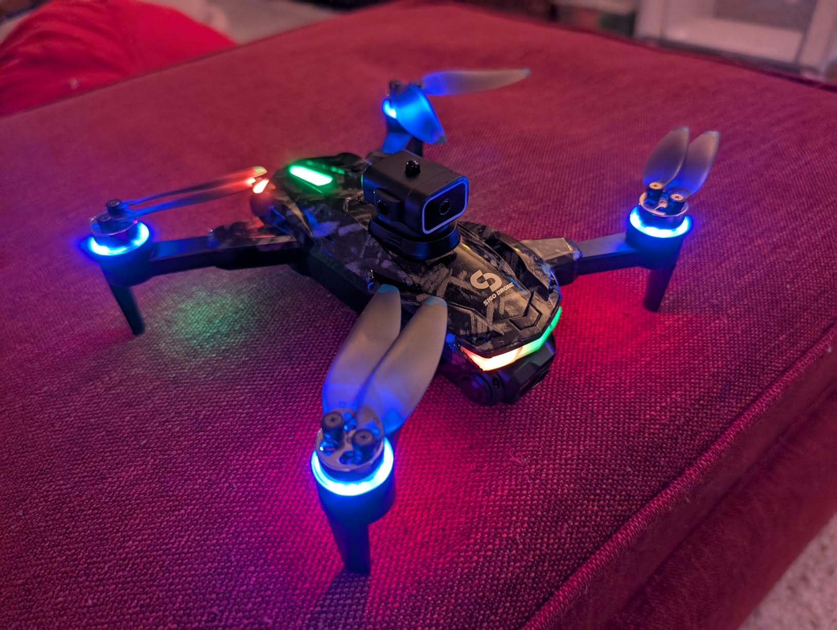 Sí, tiene luces LED delanteras que ayudan a mantener visibilidad durante vuelos nocturnos.